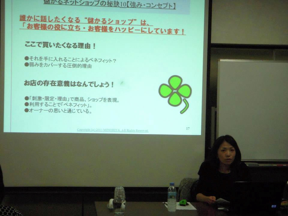 ・ネットショップをやっているが、売り上げが伸び悩んでいる方 ・なかなかリピーターが増えなくて困っている方 ・女性向け商材を売りたいが、男性ばかりで女性の心を掴むのが難しいとお思いの方 ・ネットショップをはじめたいが不安に思っている方 ・自社サイトを出店したいと思っている方 ・現状のビジネスをネットを使って、売上アップしたい方 ・リピート・口コミでお金をかけない集客を行いたい方 など |